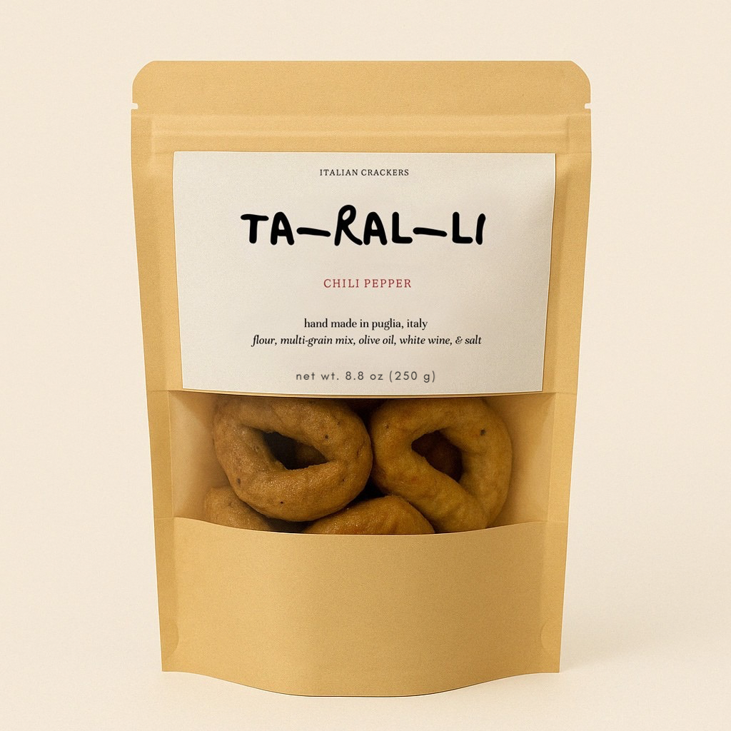 First bite: curious. Second bite: obsessed. Third bite: too late. These taralli, with their olive oil shimmer and hint of chilli pepper, have plans for you. Each made by hand and then baked to perfection.